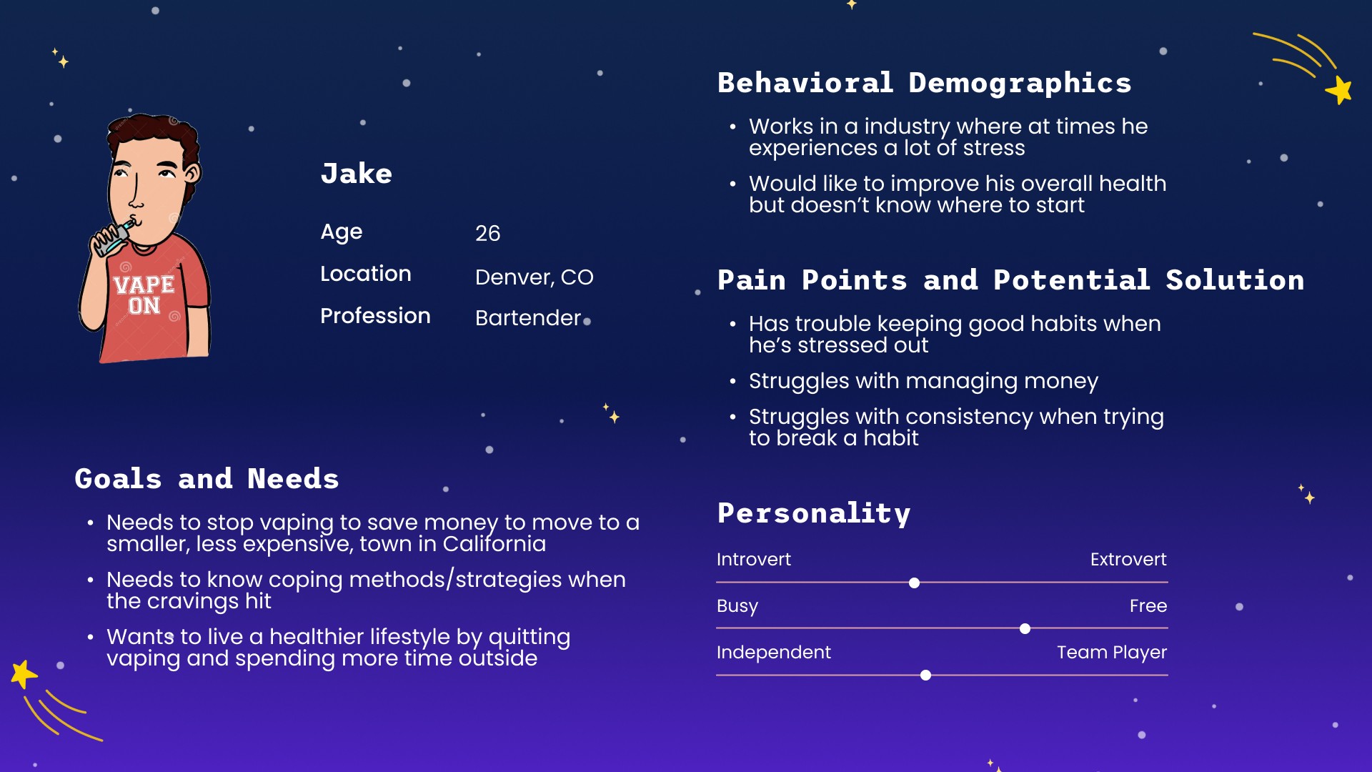 To offer those who struggle with habit breaking, specifically vaping addictions, a fun and nonjudgmental tool to consistently keep users motivated and achieving their goals.