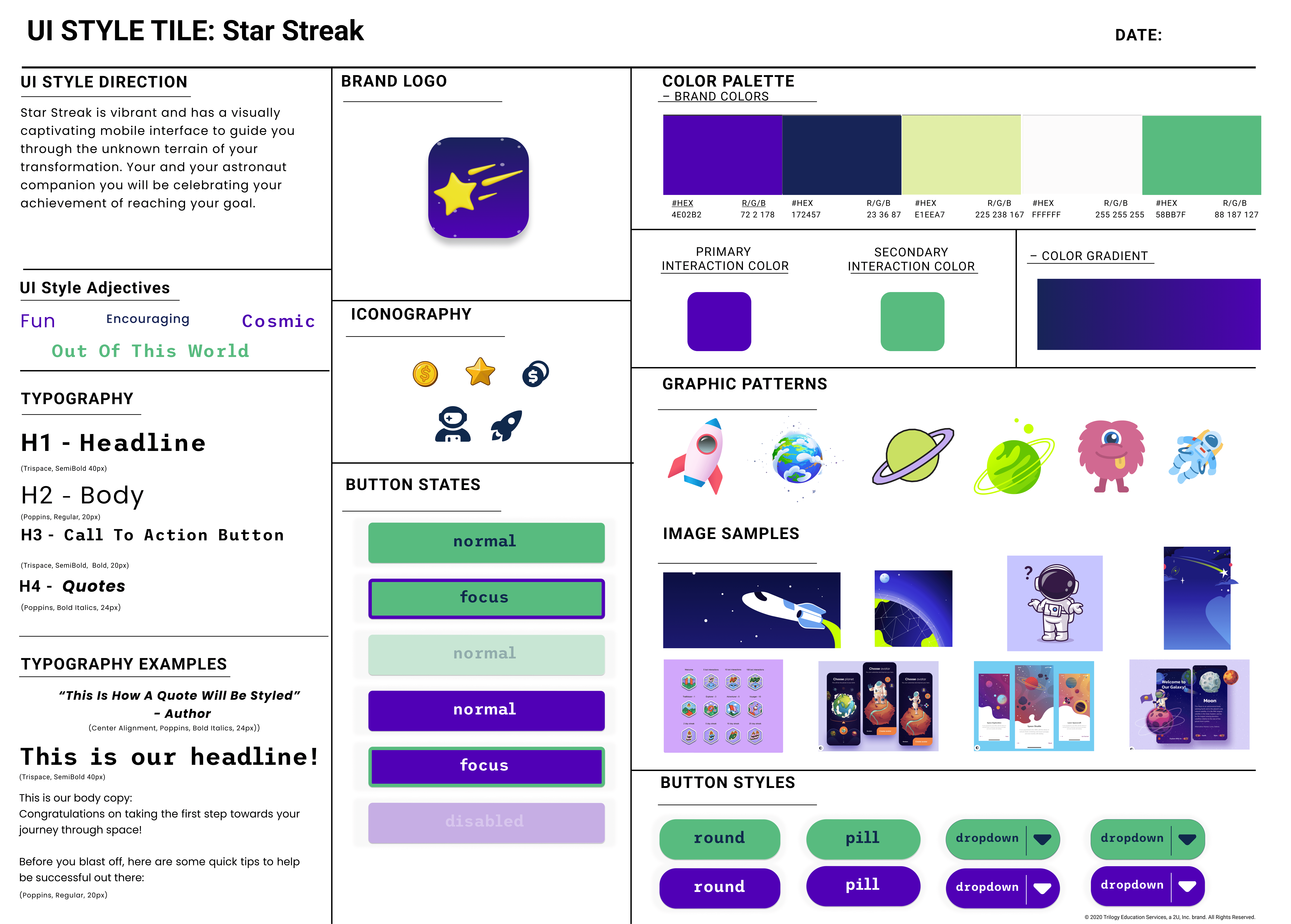 Along with another designer, I designed our different button states making sure they fit both our color palette and were color accessible. I gathered graphic patterns and image samples to help inspire our design. Finally, I created the brand logo, which is a shooting star, to represent our mobile app Star Streak.
