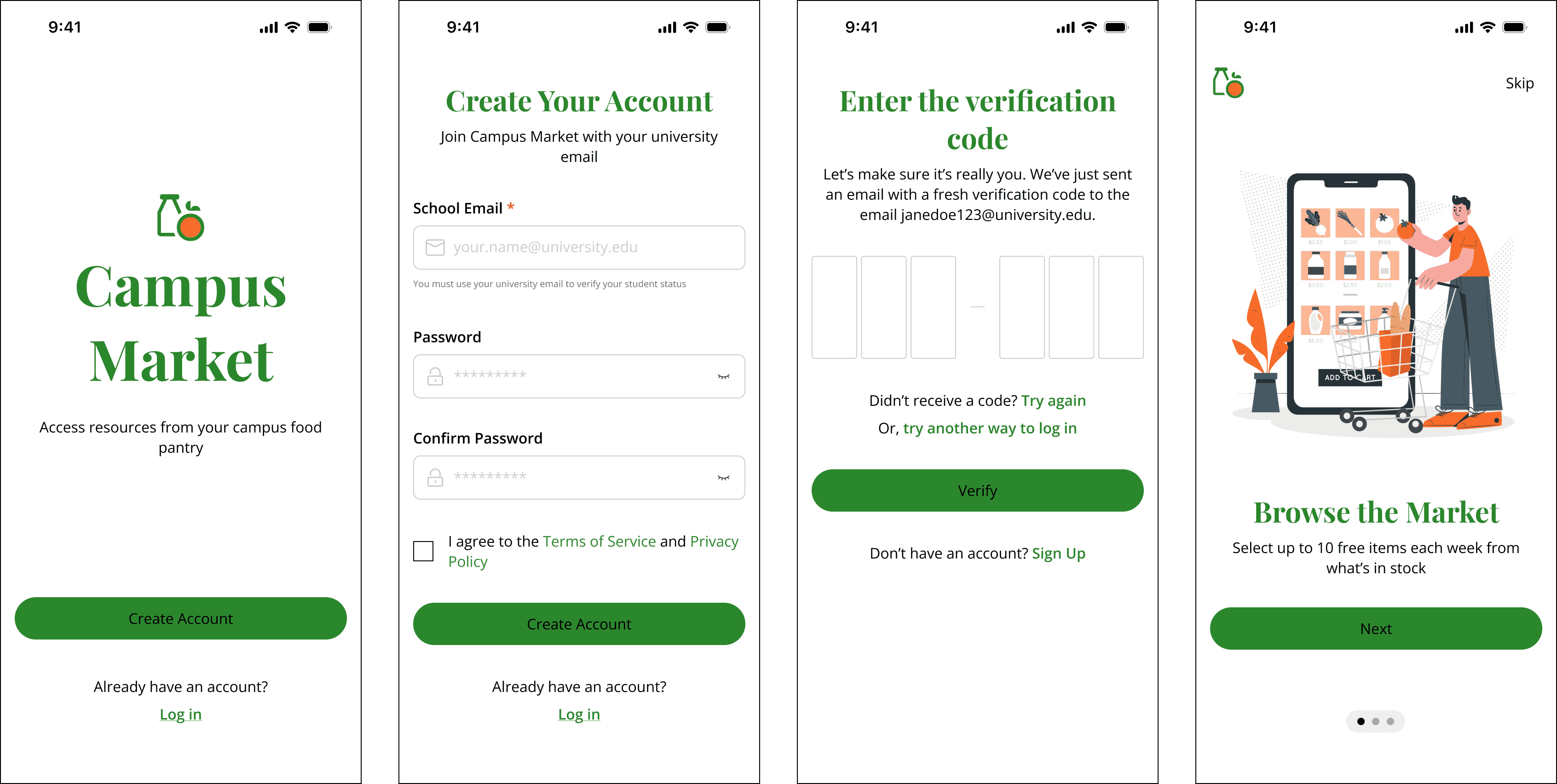 Created during Protothon 2025, Campus Market is a mobile app designed to help university students discreetly browse, reserve, and pick up food pantry groceries. With only 48 hours to design and prototype, I focused on reducing stigma and making the process simple, private, and accessible.